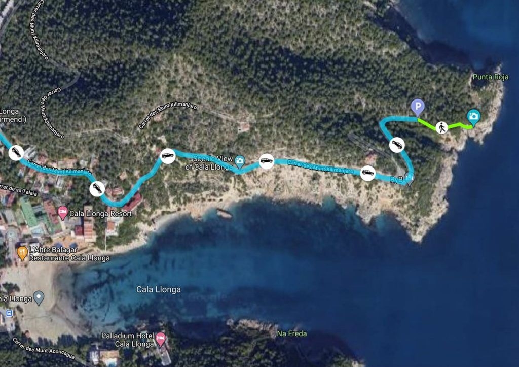 Dirigez-vous vers Cala Llonga et suivez Carrer des Munt Kilimandjaro (une route qui passe à gauche de la baie) et conduisez-la jusqu'au bout. C'est une route goudronnée qui serpente puis s'arrête. Vous devez vous y garer . Partez de là vers le littoral, vous découvrirez un chemin étroit juste derrière cet arbre (voir photo). De là, vous suivez le chemin vers la mer, après environ 10 minutes de marche, vous verrez la grotte sur votre droite.